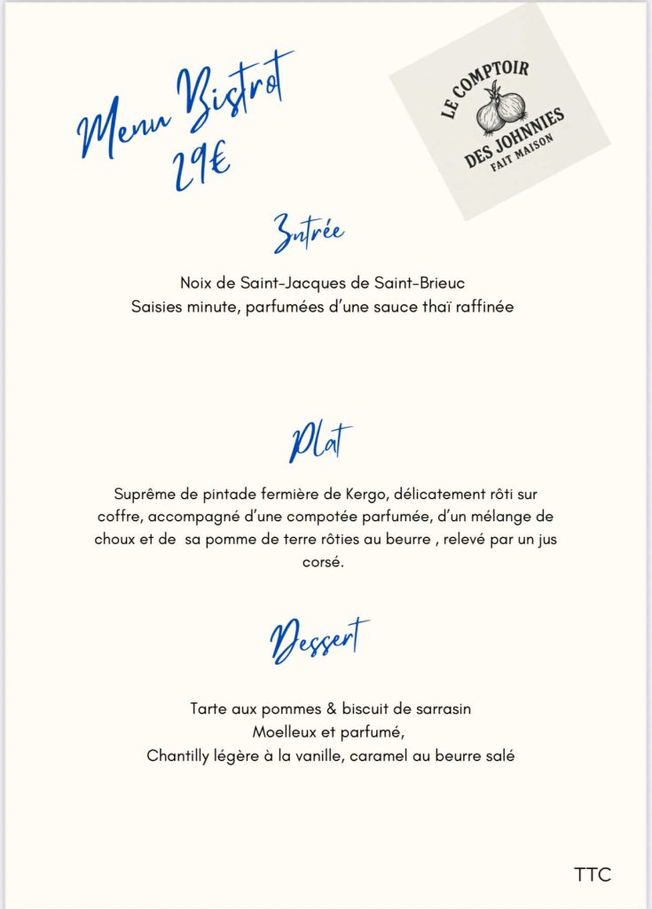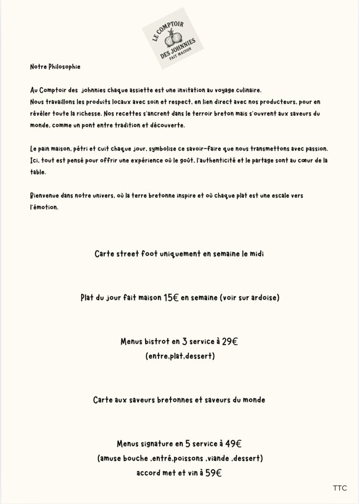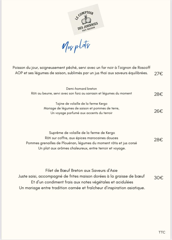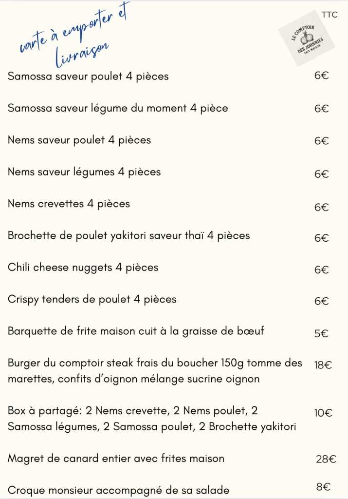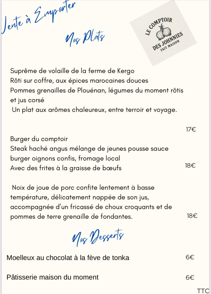 Notre menu Au Comptoir des Johnnies, le fait maison et le local sont au cœur de notre cuisine ! Notre carte Nos formules Vente à emporter